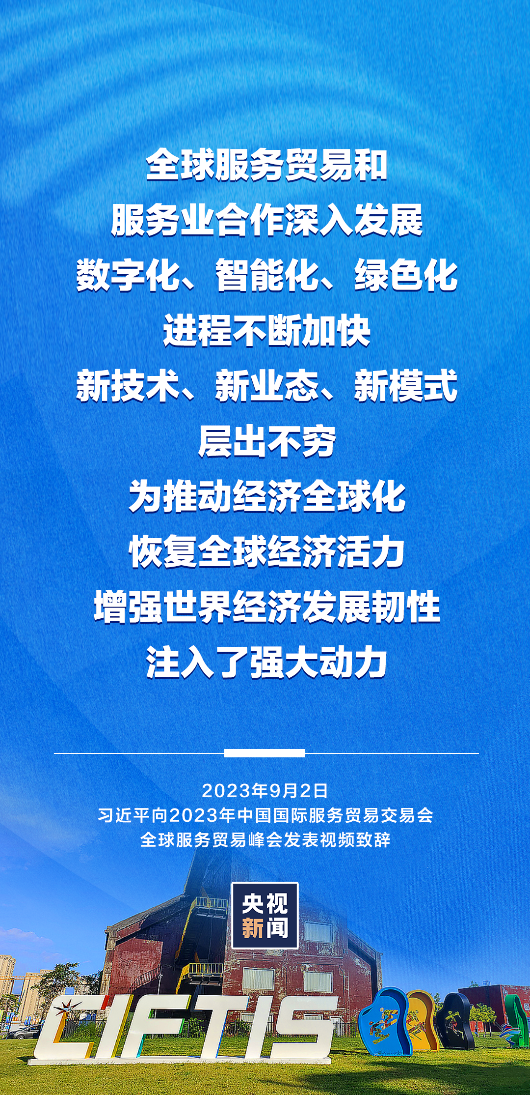 9月2日上午,国家主席习近平在北京向2023年中国国际服务贸易交易会全球服务贸易峰会发表视频致辞。